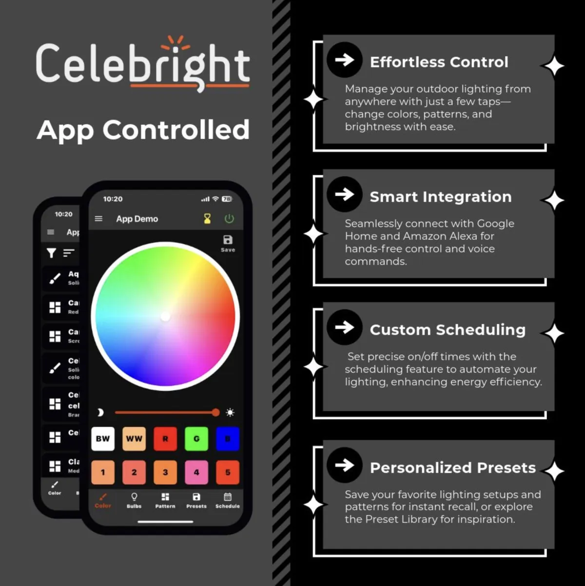 Absolutely. With the Celebright app, you can change colors, set schedules, and save your favorite presets for holidays and special events. The system offers over 16 million color options, giving you endless ways to customize the look of your home. Plus, it integrates with Google Home and Alexa for easy voice control.
